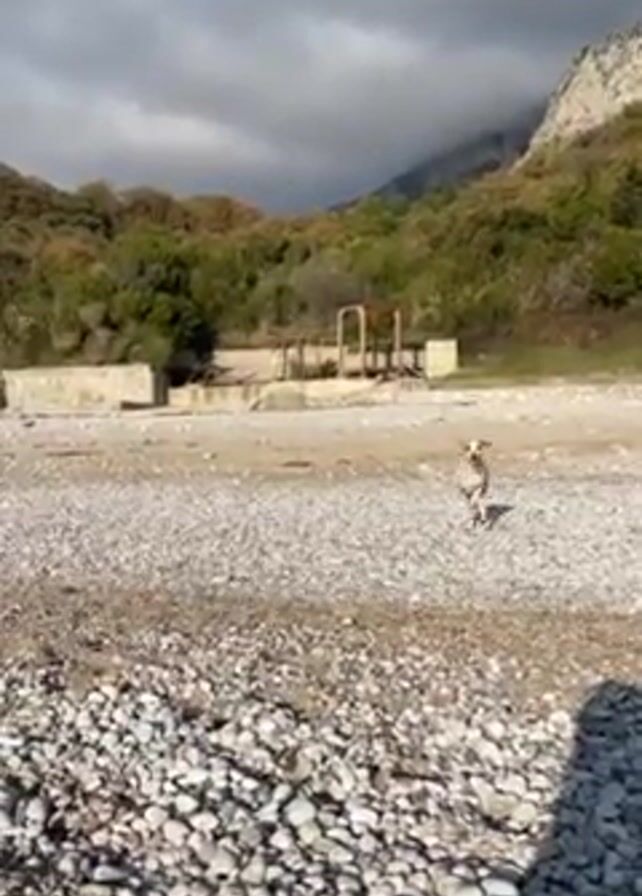 A white and tan dog runs on a rocky and sandy beach towards the viewer. The dog is small to medium-sized with a white coat, tan spots, and floppy ears. The beach is covered in light-colored pebbles and sand. In the background, there is a rocky shoreline with green vegetation and cloudy skies. The dog runs into the water and then excitedly approaches the person recording the video.