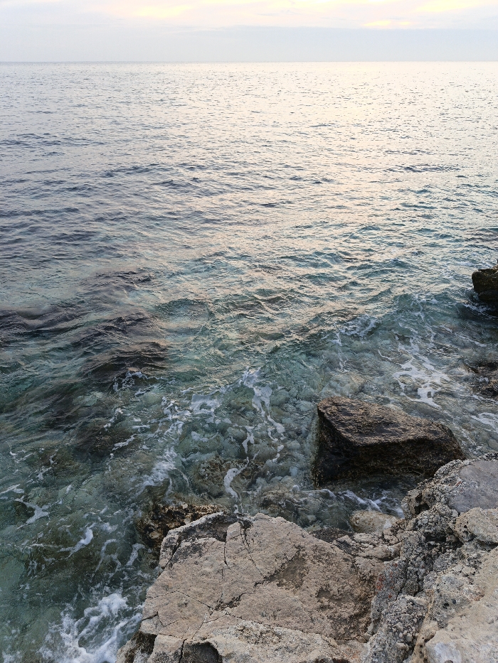 A serene coastal scene showcases a meeting of the sea and rocky shore. Clear, turquoise water gently washes over stones, revealing their shapes beneath the surface. White foam traces the edges of the waves. Larger, dark rocks are partially submerged. The horizon stretches into the distance under a muted sky. The overall effect is calming and emphasizes the natural beauty of the seascape.