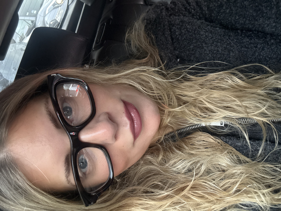 A fair-skinned woman with blonde, wavy hair wears black-framed glasses. Her lips are glossy and slightly parted. She wears a textured, charcoal gray jacket with a zipper. The background suggests she's in a car; a dark headrest and a glimpse of vehicles through the windshield are visible. The image is angled.