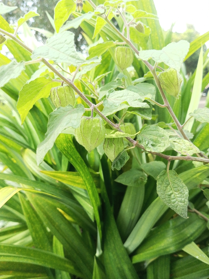 - "The image displays a close-up, vertical composition of a *Physalis* plant, commonly known as a groundcherry or cape gooseberry, against a backdrop of other foliage" by FM-25tUC3, licensed under CC BY 4.0