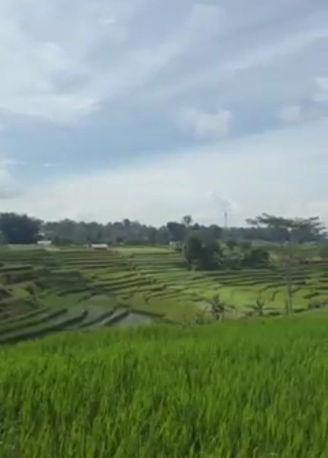 lush green landscape with rice paddies under a partly cloudy sky. The foreground is filled with tall green grass, while in the middle ground, tiered rice paddies form steps up the landscape. Trees and a few buildings are scattered amongst the rice paddies, and further back, a small tower is visible. The sky is blue with scattered white clouds. There is some indistinct chatter in the audio.