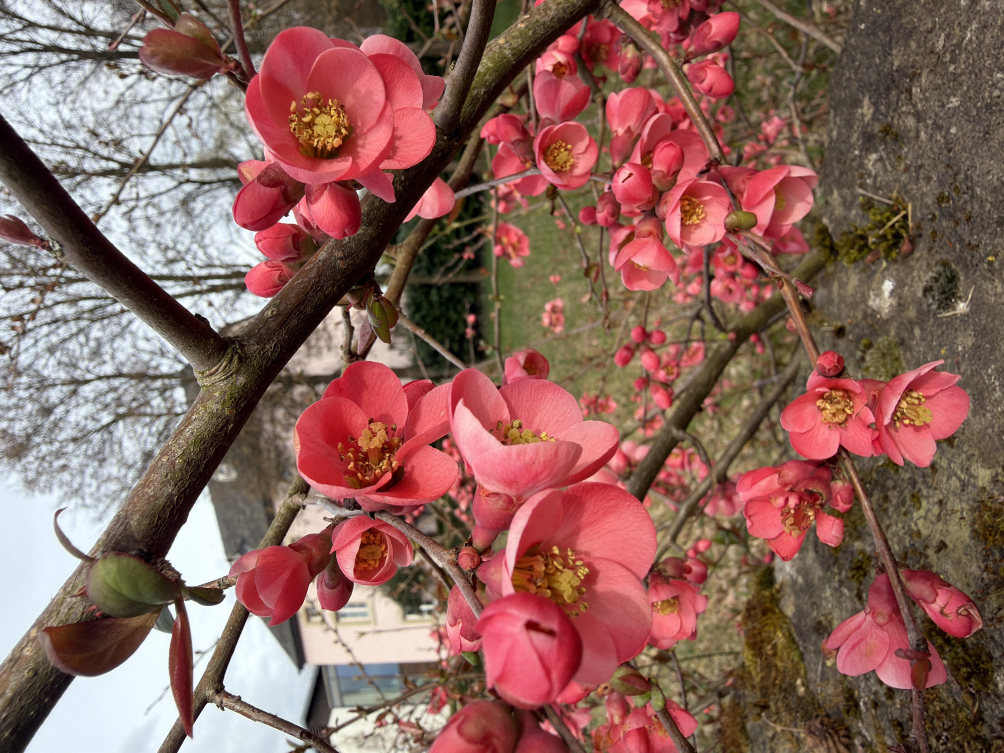 flowering quince (Chaenomeles) in bloom, likely in Junglinster, Luxembourg, based on contextual information. The flowers are a vibrant pink-red color, with yellow stamens visible in the open blossoms. Some flowers are fully open, while others are still in bud. The flowering quince branches are visible, with some attached to a wall covered in moss. In the background, blurred elements suggest a residential area with buildings and trees without leaves, possibly during early spring. The overall composition focuses on the detail of the blossoms.
