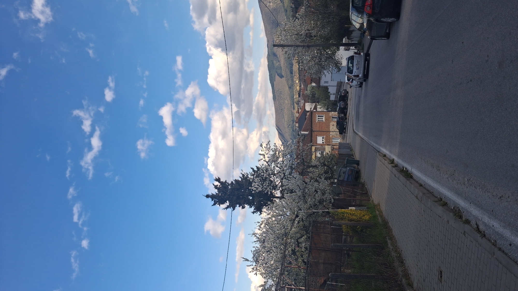 The image depicts a street scene in Goce Delchev, Bulgaria, during daylight. The sky, predominantly blue, is adorned with scattered white clouds. A mountain range is visible in the background. The street is lined with trees in full bloom, suggesting springtime. Several vehicles, including cars and a van, are parked along the roadside. Buildings, including residential houses with brick facades, are situated along the street. A paved sidewalk borders the road. Power lines stretch across the sky.