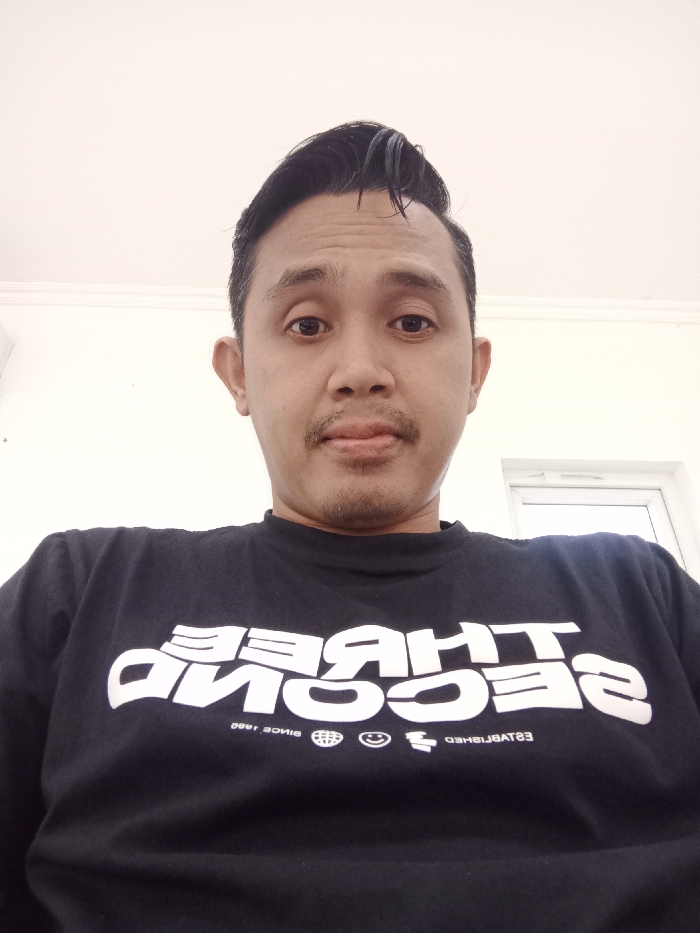 A man with dark hair styled upwards is looking directly at the camera. He has brown eyes, a mustache, and light stubble. He is wearing a black t-shirt with the word "SECOND" prominently displayed in white, likely part of a larger brand name. The background is a plain, light-colored wall with a window visible on the right side of the frame. The lighting is bright and even.