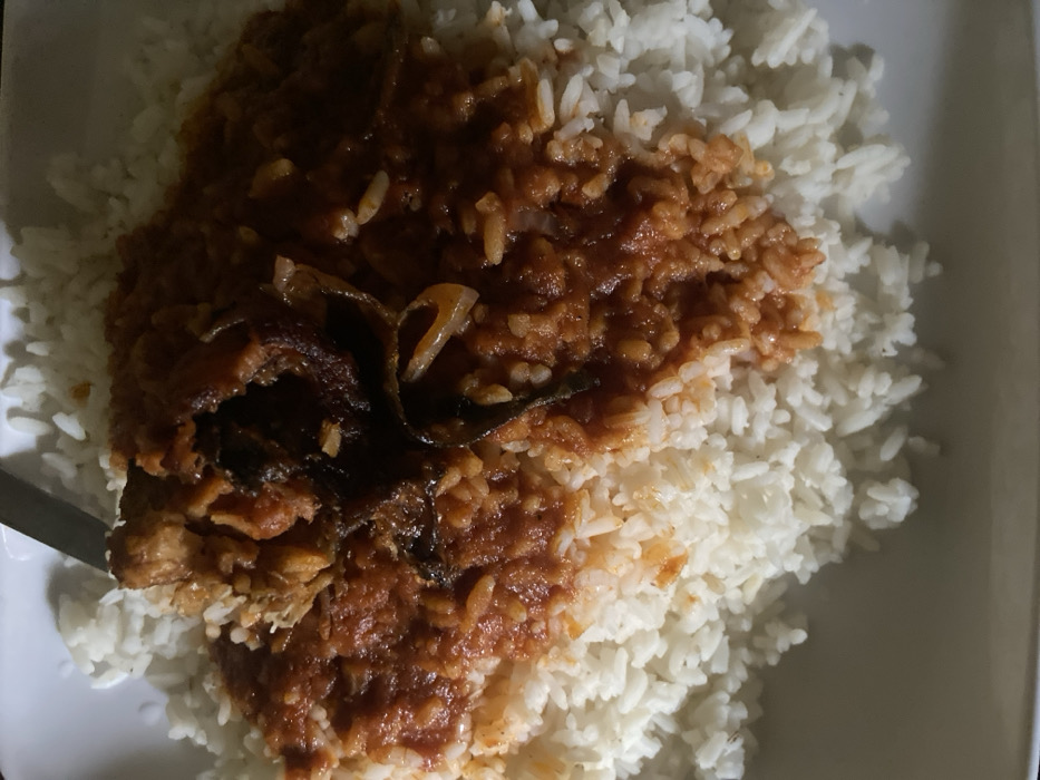 A white plate in Oba, Nigeria, contains a serving of food. The plate is primarily filled with white, cooked long-grain rice, which forms the base of the meal. Layered over a portion of the rice is a reddish-orange stew or sauce. Within this stew, a large, dark brown piece of what appears to be fried fish or meat is centrally positioned, with its texture suggesting a cooked or crispy exterior. Smaller, darker, elongated elements are also visible within the sauce, resembling cooked vegetables or additional protein fragments. A metallic object, likely a utensil, is partially visible at the top left edge of the plate, resting on the rice. The lighting suggests an indoor setting.