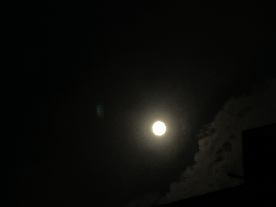 This image depicts a night sky scene located in Homs, Syria. A prominent, bright, circular moon is visible in the upper-middle portion of the frame, serving as the primary light source. Dark clouds are present, primarily in the lower-left quadrant, partially obscuring the sky and exhibiting faint illumination from the moon's glow. A dark, indistinct silhouette of what appears to be a building or architectural structure occupies the lower-left corner, extending diagonally upwards. A faint, diffuse greenish light or atmospheric phenomenon is visible above and to the right of the moon. No people, specific actions, or interactions are discernible.