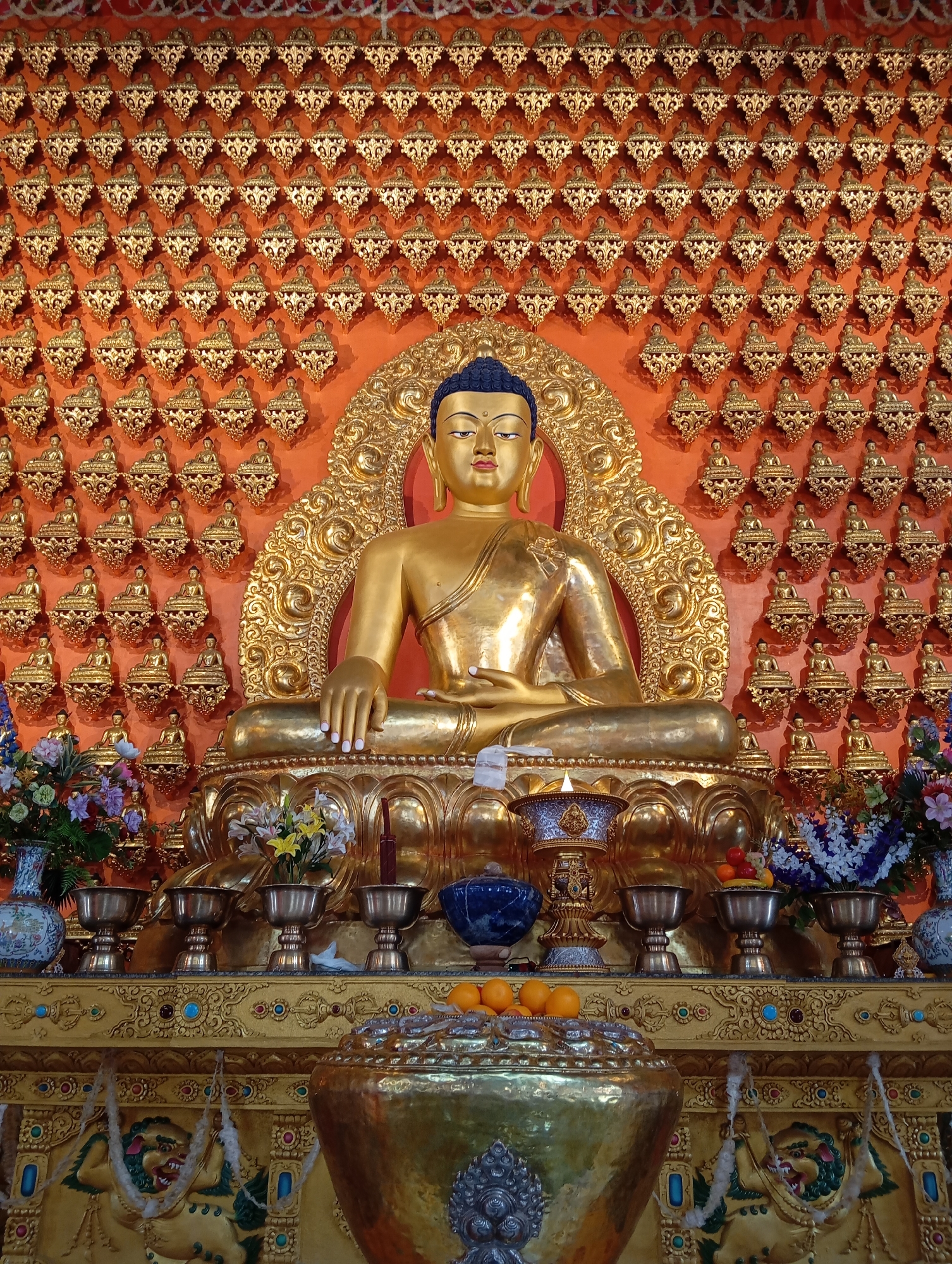 A golden Buddha statue is seated in a meditation pose atop an ornately decorated altar in Oshojetban, Nepal