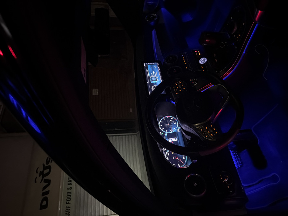 - "The image captures the interior of a modern vehicle, specifically the dashboard, steering wheel, and central console, illuminated by ambient blue and red lighting" by FM-cY6DC2, licensed under CC BY 4.0