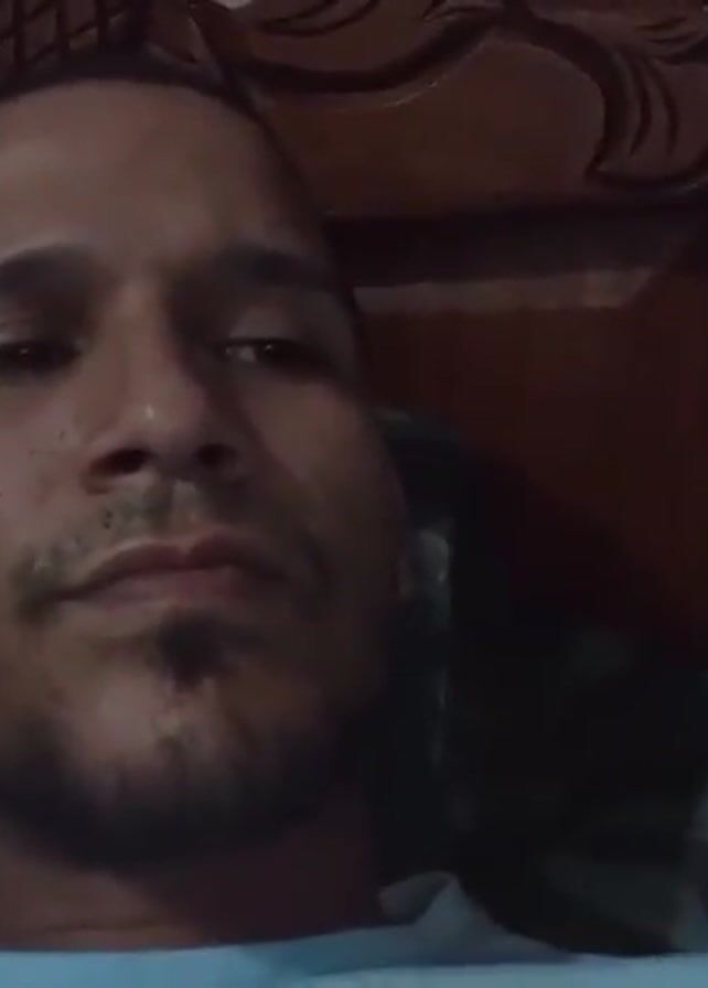 A man is lying on a bed. He is wearing a light blue shirt. He has a trimmed beard and dark hair. He looks towards the camera. There is audio playing in the background. The headboard of the bed is dark wood. The pillow beneath him has a dark pattern.