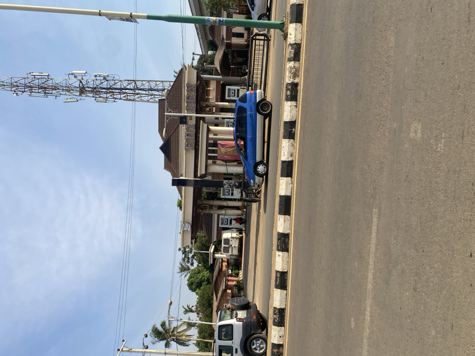 This image captures a street scene in Maigizo, Nigeria, looking towards a petrol station and commercial buildings under a clear blue sky