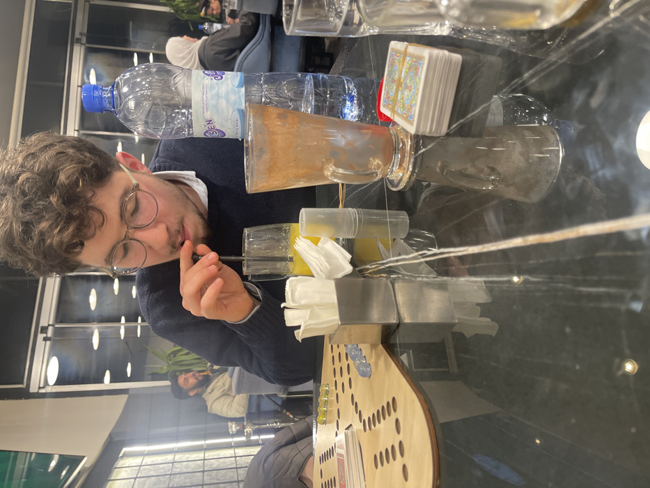 A man with curly hair and glasses drinks from a glass with a straw. On the table is a bottle of water, a deck of cards, a game board with pegs, a glass of juice, napkins, and empty glasses. The table is reflective and dark. Other people can be seen in the background, sitting at other tables. The scene appears to be indoors, possibly a restaurant or café.