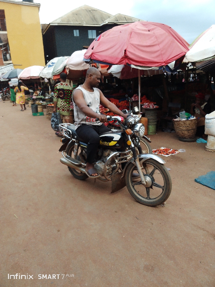 An individual rides a black and silver motorcycle on a dirt path within a bustling outdoor market. The person wears a white sleeveless shirt and black pants, with sandals on their feet. Overhead, numerous market umbrellas provide shade. A building is visible in the background. The motorcycle is parked, with a visible pile of tomatoes in front of it. The scene is captured by an Infinix SMART 7 PLUS camera.
