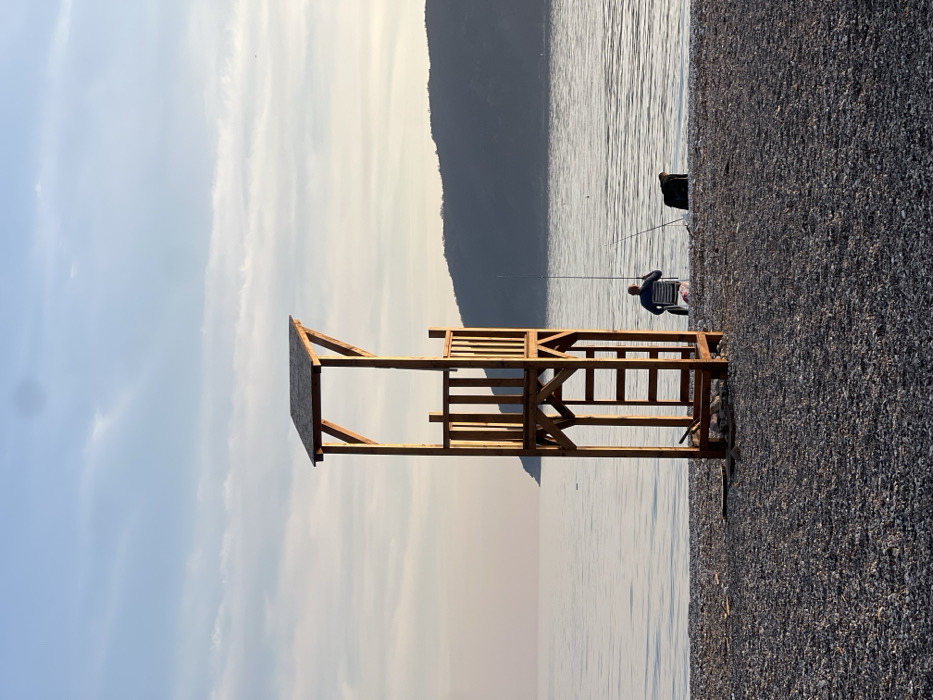 The image displays a coastal landscape in Budva, Montenegro, observed during either sunrise or sunset. A tall, multi-level wooden structure, resembling a lifeguard stand, stands prominently on a dark grey pebble beach. This structure features a gabled roof, an upper platform enclosed by vertical wooden railings, and an integrated ladder on its seaward face. To the right of the wooden structure, a single individual is seated in a light-colored, low-backed chair, facing the calm sea. The person wears a dark-colored top and is engaged in fishing, holding one fishing rod with its line cast into the water. A second fishing rod stands upright on the pebbles beside the seated individual, also with its line submerged. A dark bag or object rests on the pebbles adjacent to the person. The sea surface is smooth with minimal ripples, reflecting the ambient light. In the background, dark-hued hills or mountains rise directly from the water on the right side of the frame, with a smaller landmass visible further to the left. The sky exhibits a gradient from light blue at the zenith to a pale orange-yellow near the horizon, interspersed with sparse, wispy clouds. The soft, directional lighting is consistent with either dawn or dusk.
