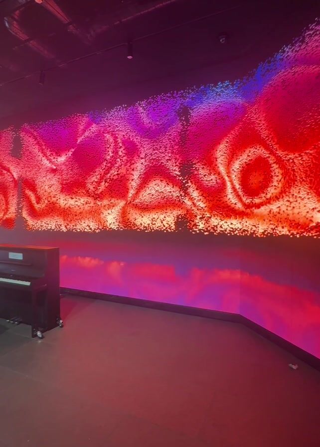 The scene is an art installation space featuring a dark room with a vibrant, abstract LED display across one wall. The display showcases a dynamic pattern of red, purple, and blue light, appearing to ripple and swirl. A black piano is positioned on the left side of the room. The floor is a reddish-brown, and the ceiling is dark with visible ductwork and track lighting. Two people appear in the latter part of the video. One individual approaches the piano, while another stands watching.