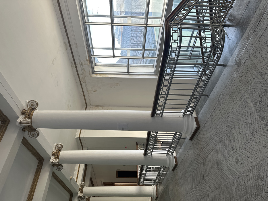 An interior corridor on an upper floor of the Lomonosov Moscow State University Main Building, located on Vorobyovy Gory, Moscow, Russia, is depicted. The scene features a linear progression of white, round columns, each topped with an ornate gold-colored Ionic capital, supporting a white ceiling detailed with a gold-accented cornice. The ceiling exhibits localized discoloration and minor staining. Light-colored walls present areas of peeling paint and surface wear, particularly near the window. The floor is a patterned grey and white, likely concrete or stone, configured in a herringbone design with visible signs of wear. To the right, a multi-level staircase or landing descends, bordered by a metal balustrade. This balustrade features a dark wooden handrail and a geometric grid pattern in its metalwork. A large, multi-paned window on the right wall provides an exterior view of urban rooftops under bright natural light. In the background, a small table with dark legs, a red wall-mounted device, and a dark rectangular object on a wall are faintly visible. No individuals are present in the scene. The environment is characterized by its aged, formal, and institutional architectural style.