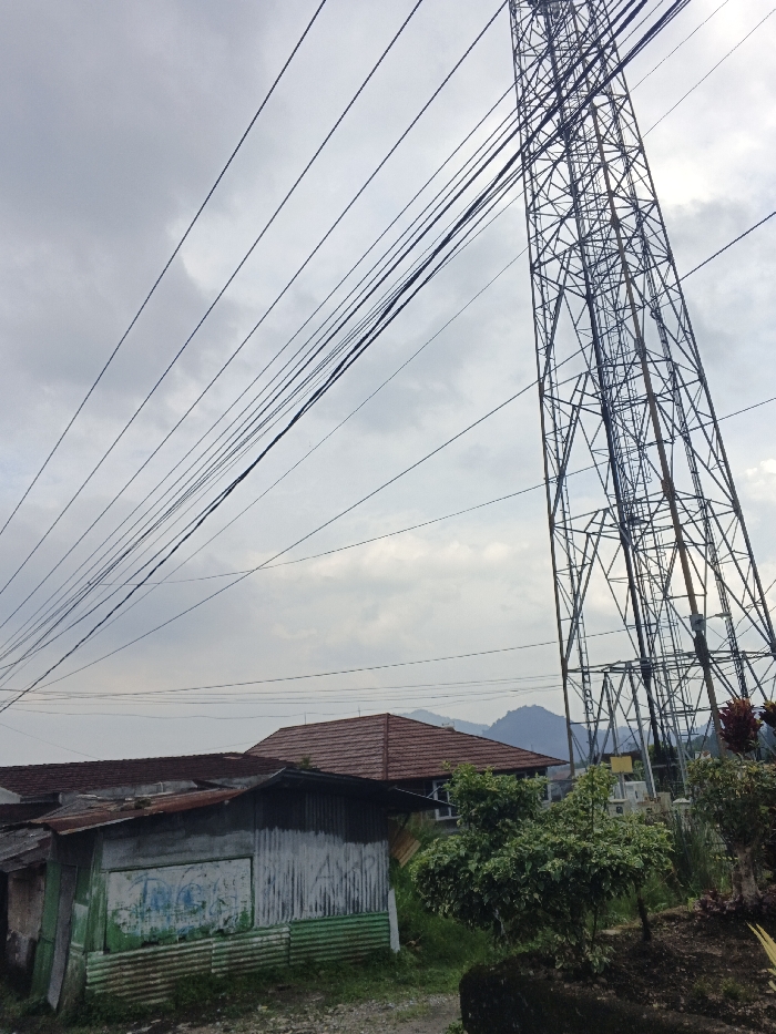 Siexiengmai, Laos. The image captures an outdoor urban-rural interface under an overcast sky featuring light grey clouds. Numerous dark power lines and communication cables traverse the upper portion of the frame diagonally from left to right. A large, dark grey, lattice-steel high-voltage transmission tower occupies the right side of the image, extending vertically beyond the frame, characterized by its open-framework structure and visible internal ladder. In the lower-left quadrant, a small, dilapidated, single-story structure is present, constructed with corrugated metal siding, partially painted in faded green and white, exhibiting graffiti-like markings. Its roof is also corrugated metal, appearing rusted. Behind this structure, parts of another building with a rusted corrugated metal roof are visible. In the mid-ground, a house with a distinct reddish-brown tiled roof is visible, revealing a white wall segment and a window. Further back, another similar tiled roof is present. Scattered green foliage, including small trees and bushes, grows in the foreground and around the structures, some appearing to be cultivated in a raised bed. Distant, hazy blue-grey mountains or hills define the horizon. The immediate ground surface appears to be dirt or gravel. No individuals, animals, or discernible actions are observed.