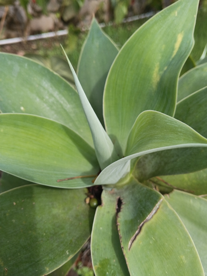 A close-up shot showcases a green agave plant, its leaves radiating outwards. The leaves are smooth with slight variations in color and linear texture, some marked by browning at the edges. A central, upright spear-like leaf stands prominently. A small, round green object is nestled near the base of the leaves, possibly a seed or part of the plant. The background is blurry, suggesting other vegetation, and a hint of a white structure.