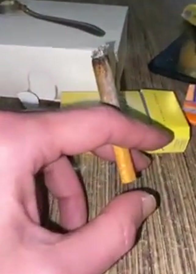 hand holding a lit cigarette over a wooden table. On the table, there is a yellow pack of cigarettes, a white box, a spoon, and a phone. The camera then moves to show a white cat curled up asleep on a brown leather chair. The camera then returns to the table.