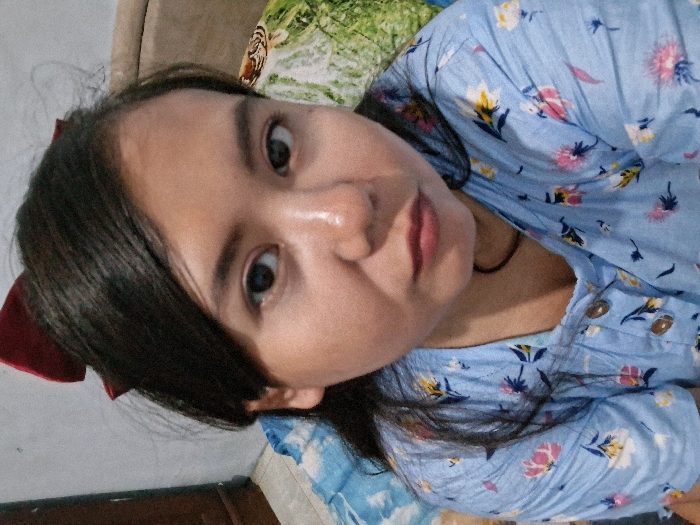 A woman with long dark hair is lying down, partially facing the camera. She has fair skin and dark eyes. She is wearing a light blue shirt with a floral pattern. Her head is tilted, and a red hair accessory is visible near her ear. The background includes a patterned pillow and a blue and white patterned blanket. The overall impression is a casual, relaxed moment captured in a close-up shot.