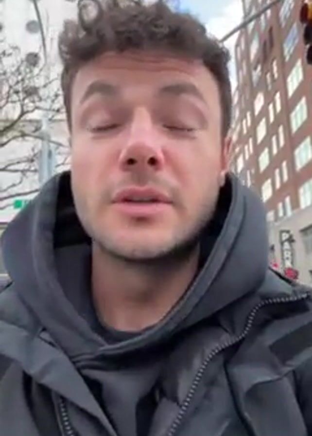 A man in a black hooded sweatshirt and jacket is standing in front of a city street. He is looking directly at the camera. He has short, curly brown hair and light eyes. The sky is partly cloudy. There is a traffic light and street sign visible to the left of the man. There are buildings in the background. The man is talking to the camera. He says, "Smile at a stranger today. Bring joy to the world. Happy Monday, everybody."