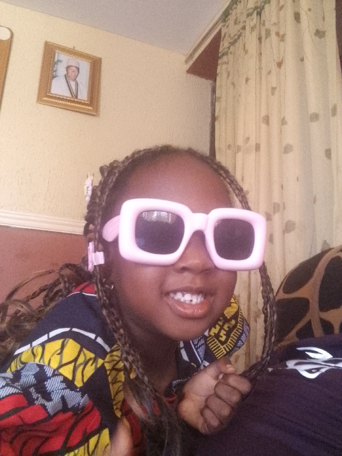 In Jos, Nigeria, a young individual with dark skin and long, dark braided hair smiles broadly while looking directly at the camera. The person is wearing oversized, square-framed pink sunglasses and a patterned garment featuring yellow, red, blue, and black geometric designs, possibly an Ankara fabric. Pink hair clips are visible near the ears. The background features a light-colored, textured wall with a white base trim. A gold-framed portrait of an adult male in white traditional attire, including a cap and what appears to be a ceremonial necklace, hangs on the wall. To the right, patterned light-colored curtains are visible. A dark object with a brown, abstract pattern and a plain dark fabric are partially visible in the lower right, suggesting upholstery.