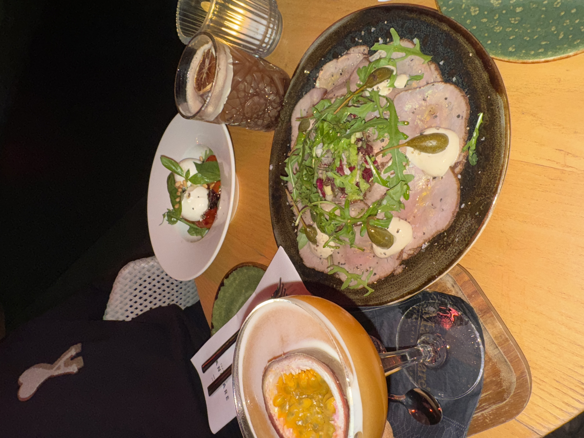 The image depicts a dining scene at Maare Restaurant & Bar in Eindhoven, Netherlands, presented from an elevated perspective. A wooden tabletop displays several dishes and beverages under dim lighting. In the foreground, a large, dark-rimmed plate holds thinly sliced meat, possibly carpaccio or vitello tonnato, topped with arugula, a creamy sauce, and caper berries. To its left, a coupe glass contains an orange cocktail with a foam head, garnished with a halved passion fruit, resting on a dark coaster and a small wooden board. A small silver spoon lies on the coaster. Further to the right, a textured glass holds a dark beverage, garnished with a dried orange slice, positioned next to a clear fluted glass candle holder with a lit candle. In the mid-ground, on a white plate, are two white cheese balls (likely burrata) surrounded by chopped tomatoes, basil leaves, and pine nuts. A white menu or paper, with the visible text "MAARE," lies near a small green dish and dark utensils. A person wearing a dark top with a light-colored, stylized logo is partially visible on the left, next to a white mesh chair. The background is dark and out of focus, suggesting an evening or low-light setting.