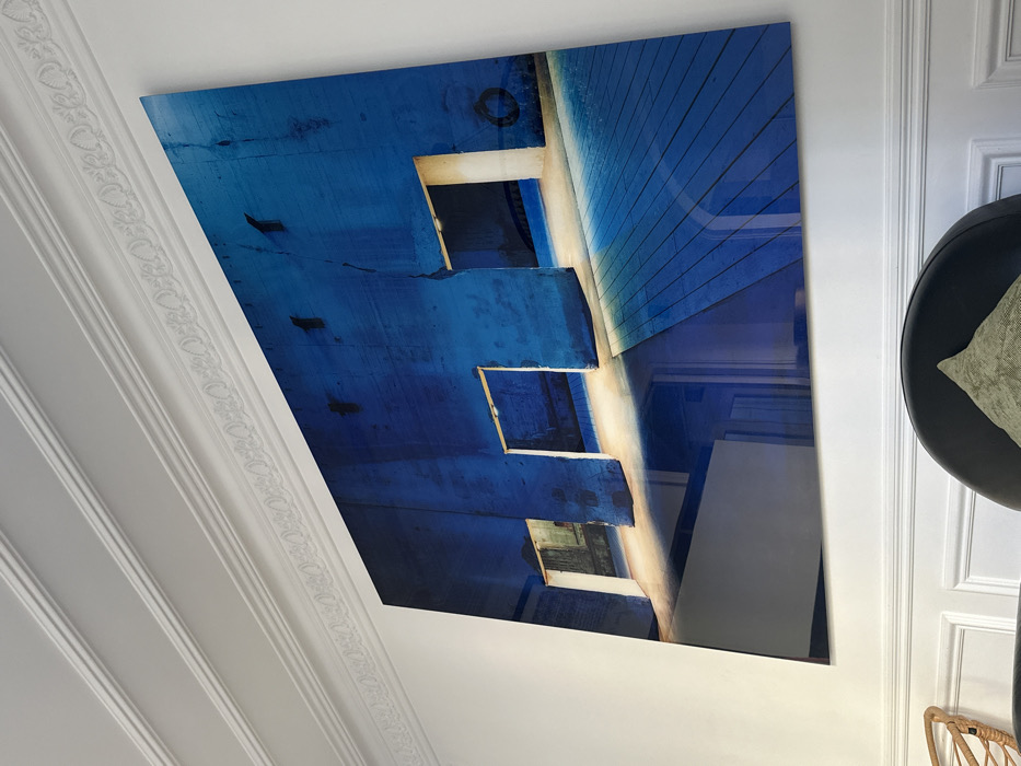 A large, reflective, rectangular artwork depicting a blue architectural scene is mounted centrally on a white wall