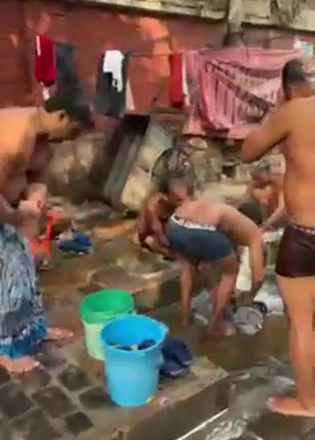 group of men bathing outdoors in what appears to be a public or communal space. They are using buckets and soapy water to wash themselves. The setting seems to be a narrow street or alley, judging from the close proximity of buildings and the presence of a traffic sign. Laundry is hanging to dry in the background. The environment is wet and there is debris on the ground. The camera appears to be moving, suggesting it is being operated from a vehicle.
