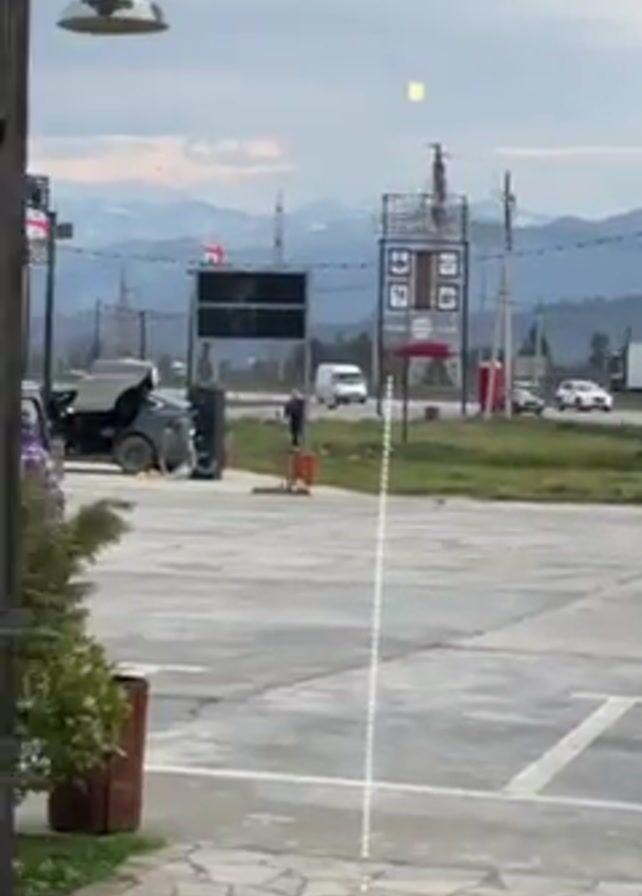 parking lot with a white Fiat 124 Spider parked in a space. A man in a brown vest is standing near the driver's side door. In the background, a Georgian flag flies on a pole, and mountains are visible in the distance. Cars and trucks drive along a road. The camera angle appears to be from inside a building or structure, looking out through a window. A wooden beam and a light fixture are in the foreground, slightly obscuring the view.