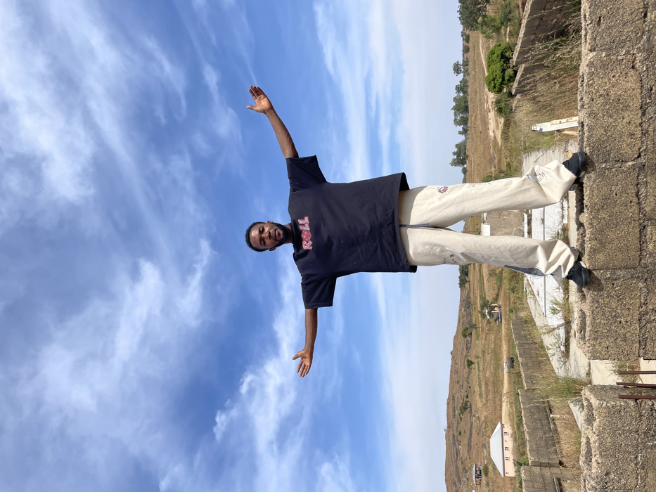 A male individual stands centrally atop a weathered concrete block wall in what is identified as a semi-rural area of the city of DU, Nigeria. The man, appearing in his twenties or early thirties, has short dark hair and a beard. He wears a black short-sleeved t-shirt with "ROLL" and a red patterned design on the chest, light beige loose-fitting trousers with scattered designs or patches, and dark sneakers. His arms are outstretched horizontally, palms open, and he looks directly forward. Behind the man, an expansive landscape unfolds under a clear blue sky with scattered white clouds. The terrain consists of dry, golden-brown rolling hills and plains with sparse green trees and vegetation. In the mid-ground to the left, a single-story, light-colored house with a dark roof is visible, along with other distant, indistinct structures. The concrete wall in the foreground shows exposed aggregate, with dry grass growing in crevices. The scene is illuminated by natural daylight.