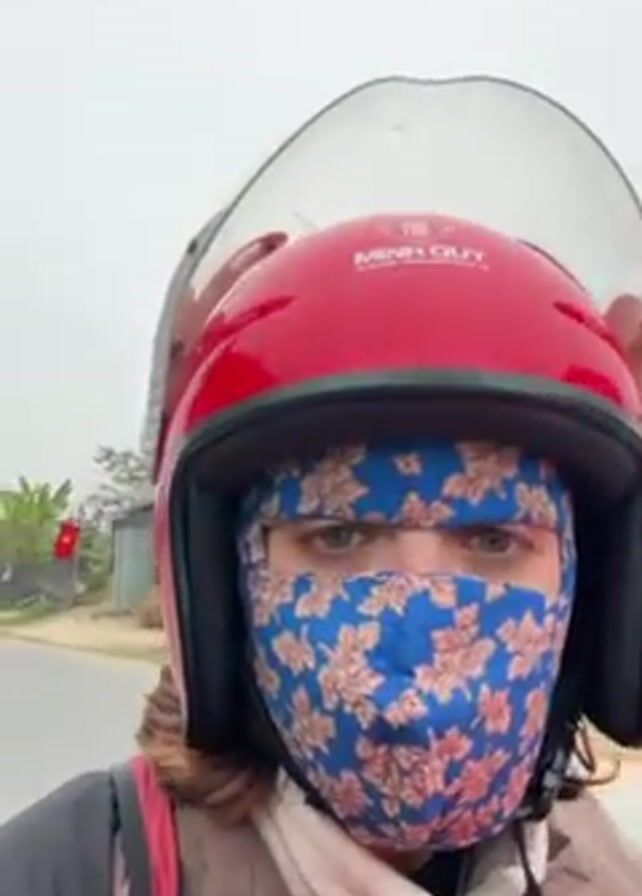 person riding a moped on a road. The person is wearing a red helmet and a blue patterned face covering. The person has green eyes, and they are looking directly at the camera. The road is paved, and there are buildings and trees in the background. The sky is overcast.