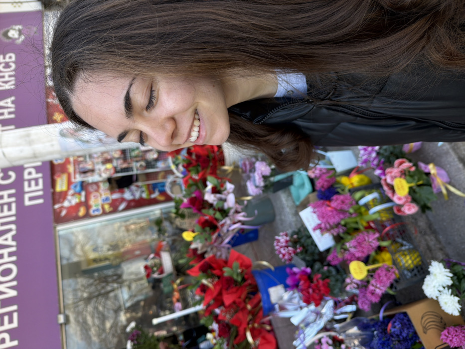 A female subject is depicted on the right side of the frame, facing left with eyes closed and a wide smile, revealing teeth. She has long, dark brown hair, fair complexion, and wears a black puffer vest over a light-colored top. The scene is outdoors, on a paved surface, in front of a commercial establishment identified as a flower shop in Pernik, Bulgaria. A purple sign above the shop features Cyrillic text reading "РЕГИОНАЛЕН С... ПЕРНИК" and "...НА КНСБ". The foreground and midground are filled with a diverse display of flowers and potted plants, including red poinsettias, pink cyclamen, and various pink, purple, white, and yellow blooms. These are presented in plastic pots, blue and green buckets, decorative baskets, and wrapped arrangements, some marked with yellow price tags. The shop's glass facade reflects trees and daylight. A white utility pole with attached posters is visible adjacent to the shop's sign.