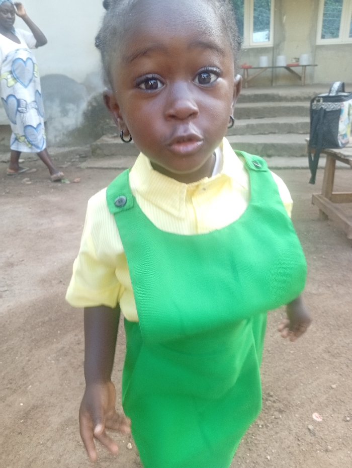 The image displays a young child positioned centrally in the foreground, directly facing the camera with wide eyes and slightly parted lips. The child, with dark skin, wears a light yellow collared shirt beneath a vibrant green pinafore dress secured by two dark buttons on the shoulder straps. Small, dark hoop earrings are visible in both ears. The child's hands are partially visible at the bottom of the frame. In the mid-ground to the left, an adult female is partially visible, wearing a white long-sleeved top and a patterned long skirt with blue heart shapes and yellow accents on a white background. Her right hand is near her head, and she stands with her left leg bent, facing slightly away from the camera. The scene is an outdoor setting in Akwanga, Nigeria, on light brown dirt ground. In the background, a light-colored building with concrete steps leading upwards is visible. Multiple windows are present on the upper section of the building. To the right, a low wooden bench or table is visible, with a black backpack adorned with white and grey patterns resting on or near it. Another small, low table holding several small white containers is situated on the steps.