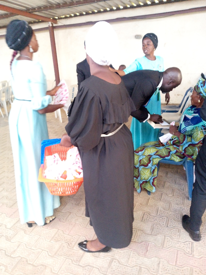 The scene depicts an indoor gathering in Television, Nigeria. Six individuals are visible within a space featuring light-colored walls, a corrugated metal roof, and a patterned tiled floor. In the immediate foreground, a person with their back to the camera wears a black long dress with a white cord belt and a white head covering. This individual holds an orange plastic basket, partially covered by a blue lid, containing numerous individually wrapped items, likely snacks or gifts. To the left, a woman in a light blue long-sleeved dress, black headwrap, and gold-accented heels faces away, appearing to hold a white and pink patterned cloth. In the mid-ground, a bald man dressed in a black suit bends forward, interacting with an older woman seated on a light blue plastic chair. The seated woman wears patterned traditional Nigerian attire, including a matching headwrap, and looks towards the man. The man holds a small white book or pamphlet in his left hand. Behind the bending man, another woman in a light blue dress and black headwrap stands, observing the interaction. A partially visible sign displaying "WELCOME 2018" is affixed to a pillar on the left. White plastic chairs are visible in the background, indicating additional seating.