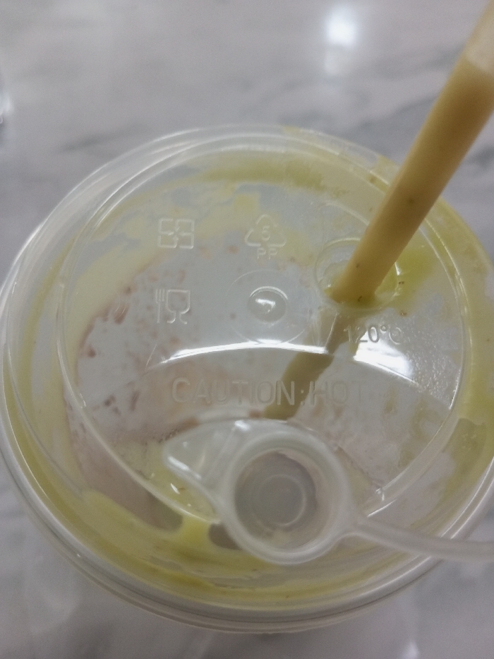 A close-up shows the top of a plastic beverage cup, covered with a clear plastic lid. A straw punctures the lid. The lid has embossed symbols, including a recycling symbol with "PP" inside, a utensil symbol, and the text "CAUTION: HOT" followed by "120°C." The lid also features a raised circular opening that is currently sealed. Yellowish liquid residue is visible inside the lid.