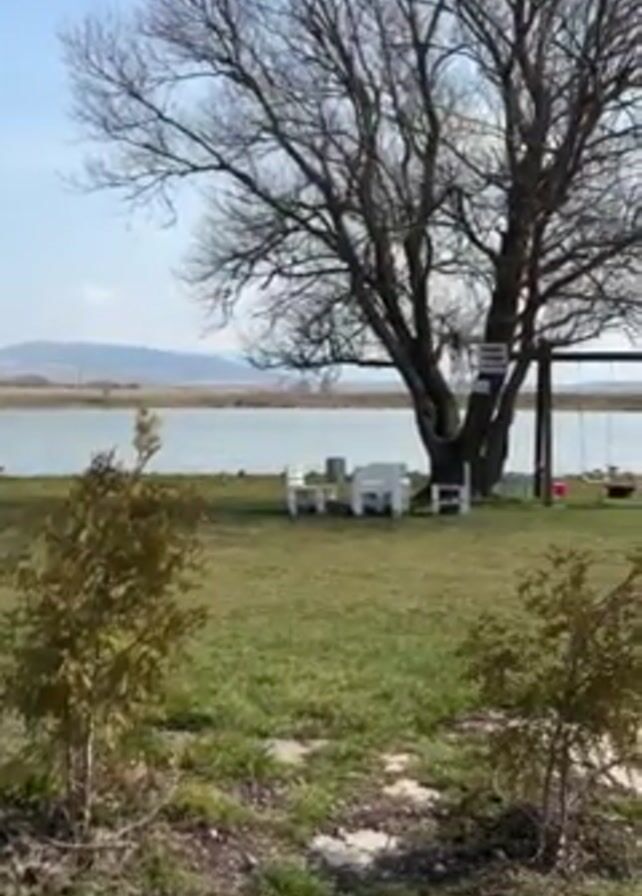 The video presents a static, medium-shot view of a tranquil lakeside scene. In the foreground, a lawn of patchy green grass is dotted with two small, evergreen shrubs. Behind this, a large, bare tree stands prominently, partially obscuring a white wooden seating area. A wooden swing set is positioned to the right of the tree, its swings gently swaying. In the background, a body of water stretches across the frame, with distant, low-lying hills visible on the horizon beneath a clear, bright sky. The overall impression is that of a peaceful, natural setting.