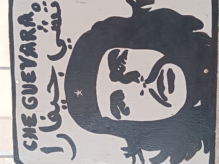 A black and white sign, confirmed to be located in the city of Meknes, Morocco, is depicted in a close-up, front-facing shot. The sign features a stylized, high-contrast portrait of Ernesto "Che" Guevara. The depiction shows a man with long, dark hair, a prominent beard, and a mustache, wearing a beret adorned with a centrally placed five-pointed star. The facial features, including the eyes, nose, and mouth, are represented by white negative space within the black silhouette. Above the portrait, the name "CHE GUEVARA" is printed in bold, sans-serif black capital letters. Below this English text and immediately above the portrait, the name "تشي جيفارا" (Tshi Jifara) is rendered in black Arabic script. The sign exhibits minor surface wear, including light scratches and small indentations. Circular holes are visible near the top left and top right edges, indicating points for mounting. The sign rests on a dark, narrow horizontal surface at the bottom, and the background is a blurred, light-colored wall or structure, with a hint of a darker element at the very top. No people or active interactions are visible.