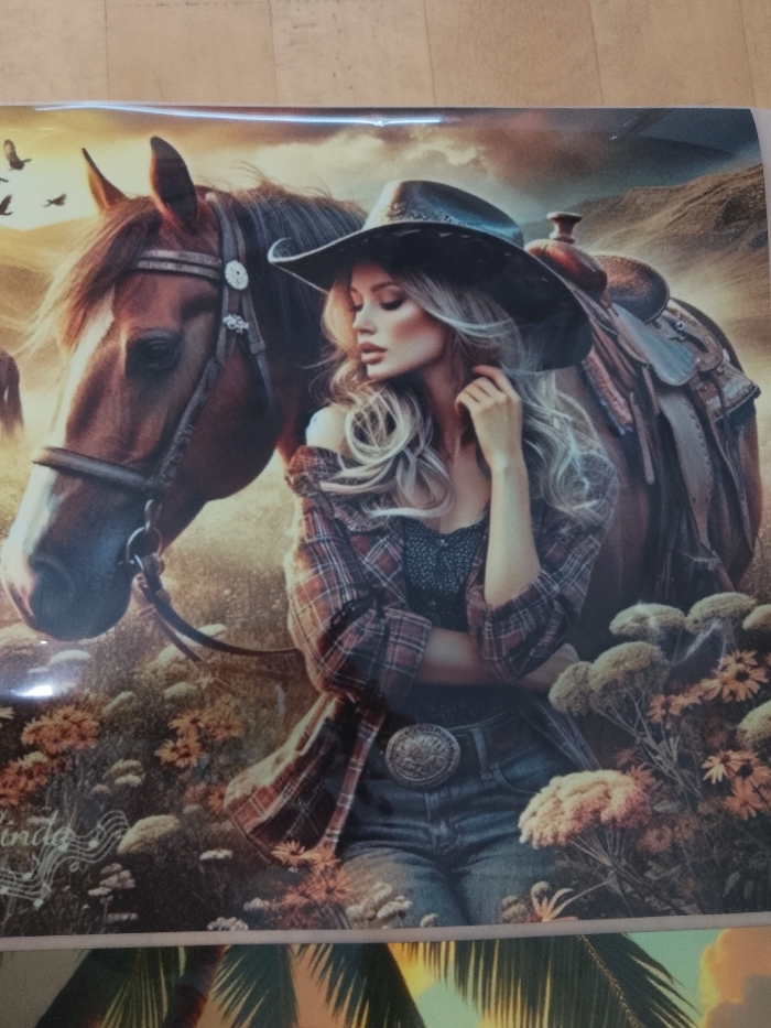 The image is a photograph of a printed artwork, depicting a woman and a horse in a naturalistic landscape. This print is located in Gorna Oryahovitsa, Bulgaria. The central figure is a female individual, shown from the waist up, with long, wavy blonde hair and a light complexion. She wears a dark, wide-brimmed cowboy hat, an unbuttoned red and black plaid shirt over a dark, possibly lace or patterned, top, blue jeans, and a prominent silver belt buckle with an intricate circular design. Her head is tilted downwards and to her right, with her eyes closed or looking down. Her right hand is raised, with fingers resting gently against her neck or jawline. To the left of the woman, a brown horse is partially visible, displaying its head and neck. The horse wears a bridle. A Western-style saddle is visible on the horse's back, positioned behind the woman. The background depicts an expansive outdoor environment at either sunrise or sunset, characterized by a warm, golden light emanating from the left. Distant rolling hills or mountains are visible under a sky with gradient hues. The immediate foreground is densely populated with various wildflowers and grasses in shades of green, yellow, and orange. Several small, dark bird silhouettes are discernible in the sky in the upper left. In the lower-left corner of the artwork, faint white cursive text is present, including the word "Florida" alongside musical notes. The photograph itself shows parts of a light-colored surface above and below the print, indicating its context as a physical object.