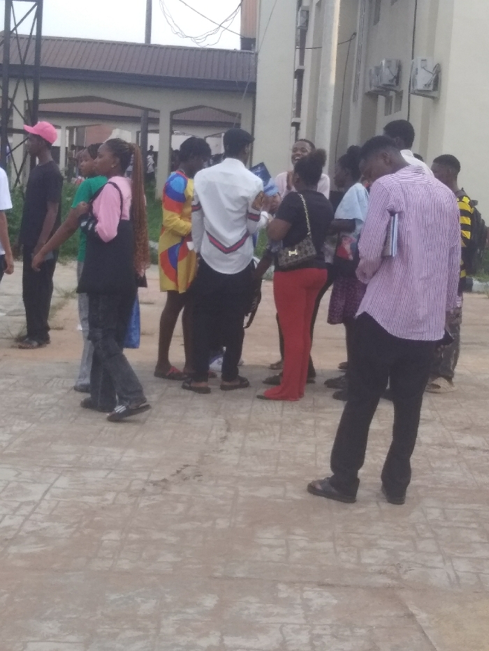 The image depicts a daytime scene in Ihiagwa, Nigeria, featuring approximately 15 individuals, primarily young adults, gathered on a light-colored, patterned paved surface