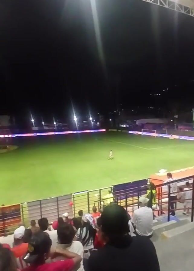 The video is shot at night from an elevated position within a stadium, likely a soccer or football venue, as evidenced by the expansive green field