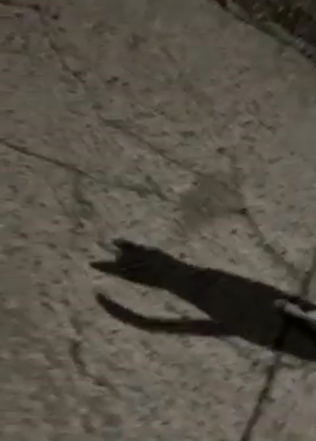 calico cat running on an asphalt surface at night. The camera follows the cat as it moves. The cat casts a large, prominent shadow. The asphalt has cracks.