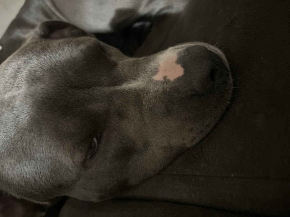 A close-up, eye-level shot captures the head of a blue-gray dog, consistent with a Pit Bull or similar breed, at rest