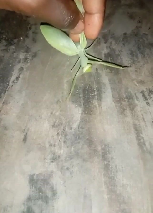 A person's hand is holding a green, leaf-like praying mantis, which is resting on a gray and worn surface