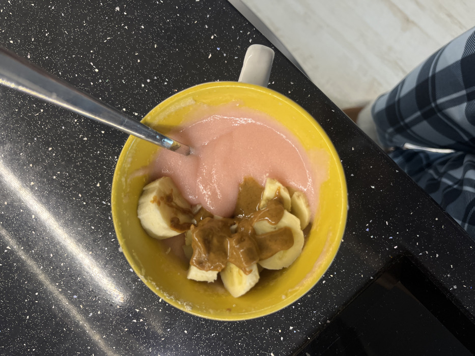 - "A yellow ceramic mug, approximately half-filled with a light pink semi-liquid food item and the other half containing several slices of banana topped with a viscous light brown substance consistent with nut butter, is positioned on a dark, speckled countertop" by FM-8H2hV2, licensed under CC BY 4.0