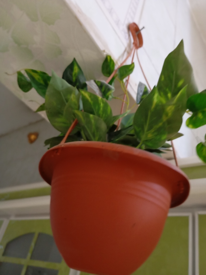 The image depicts a Pothos plant (Epipremnum aureum) suspended within a residence or sheltered area in Nasiriyah, Iraq. The plant is contained in a terracotta-colored plastic hanging pot, approximately 20-25 cm in diameter, which is suspended by three thin, reddish-brown strings converging at a brown plastic ring. This ring is affixed to a small, dark metal nail or hook embedded in a white ceiling or overhead beam featuring a subtle, embossed repeating pattern. Below the plant, a light green-painted architectural element, possibly an arched window or door frame, is partially visible to the left, with a small, golden-colored, possibly decorative object positioned above it. To the right, additional vertical and horizontal green-painted architectural elements, suggesting a window frame or wall paneling, are present. No individuals are visible in the scene.