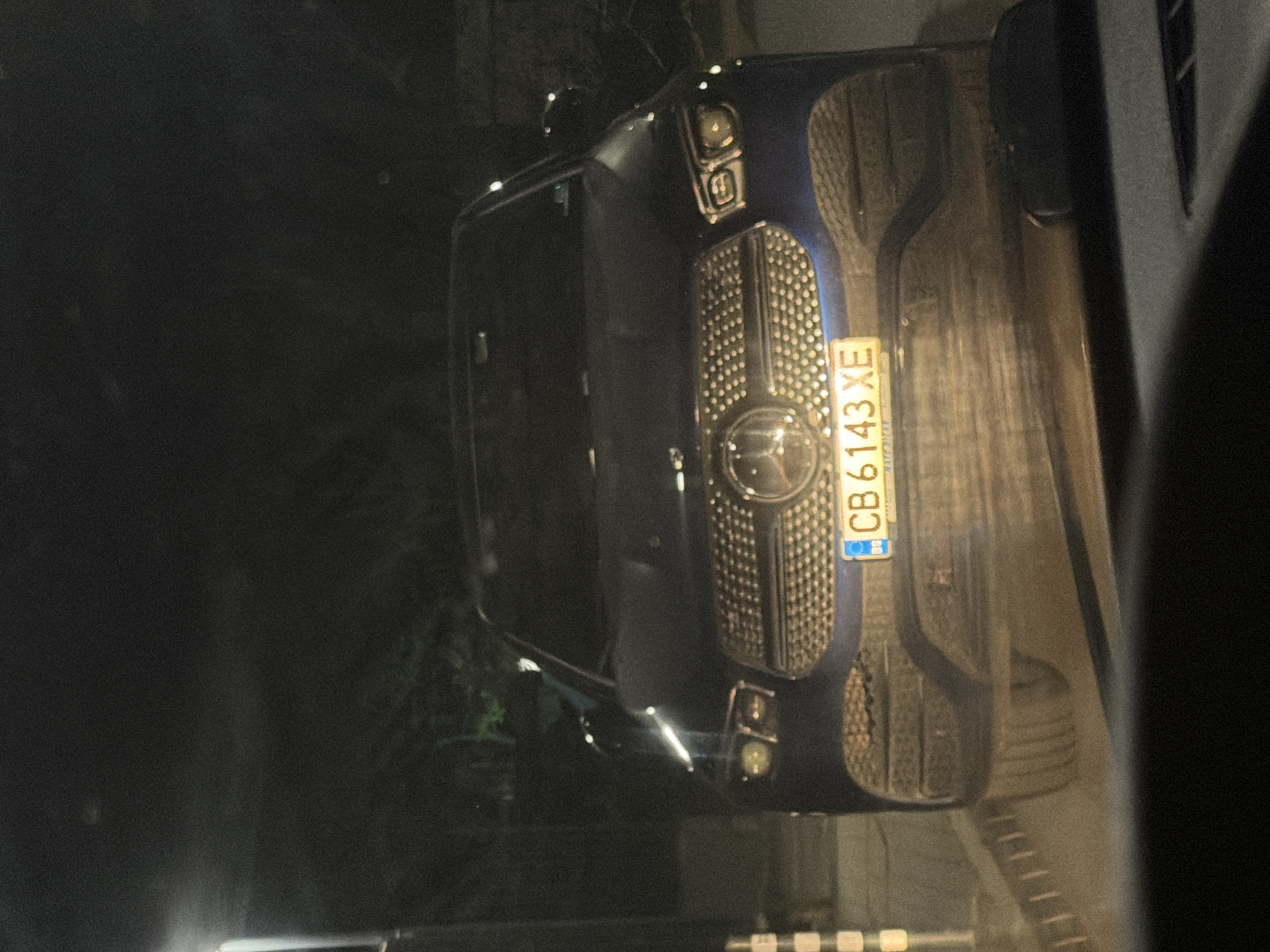 front of a dark-colored Mercedes-Benz GLE parked at night. The vehicle has a Bulgarian license plate, "CB 6143 XE," indicating it is registered in Sofia. The background is dark and blurry, suggesting a low-light environment with some vegetation visible. The location is inferred to be in Sofia, Bulgaria, based on the license plate.