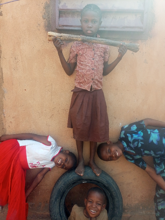 Four children are visible in an outdoor setting in Tempure, Nigeria, positioned against a light brown, textured wall