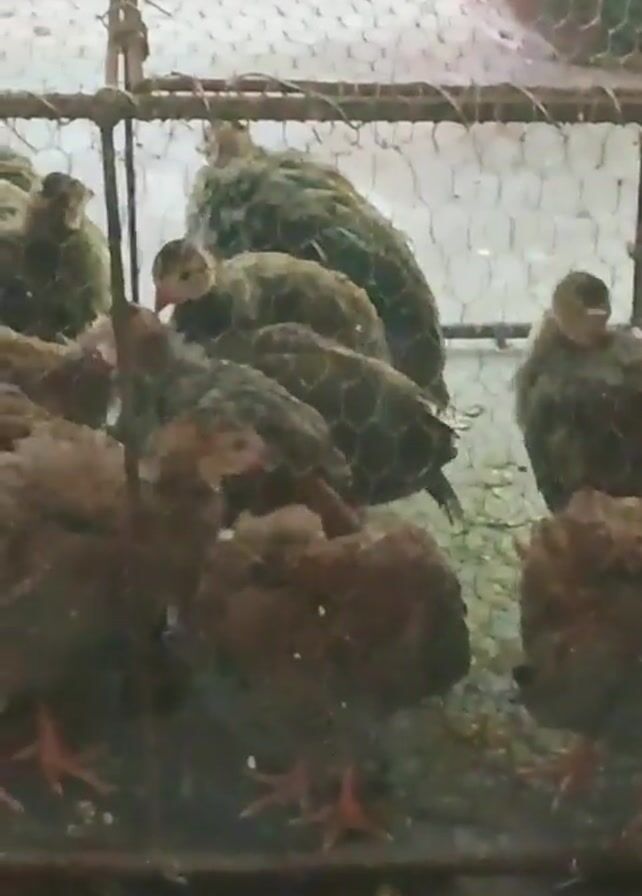 A group of juvenile brown birds are crammed into a cage made of chicken wire. The birds are bunched together, with several standing in the foreground of the frame. A small red water feeder is visible in the bottom left corner of the cage. The floor of the cage is dark and appears to be covered in straw or wood shavings. The background is blurry, but appears to be an outdoor or agricultural setting.