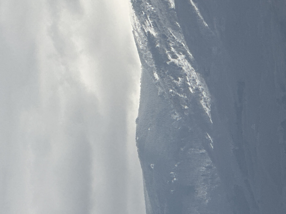 The image displays a distant view of snow-covered mountainous terrain, specifically Vitosha Mountain, as observed from the city of Sofia, Bulgaria. The upper portion of the frame is dominated by a grey, overcast sky, with areas of lighter cloud cover suggesting diffused light conditions. The mid-ground and foreground reveal densely forested slopes partially covered by snow. Snowfall is evident on the upper elevations and within tree lines, forming white patches and streaks, contrasting with darker, exposed vegetation and rock formations. The lower portions of the visible mountain slopes appear darker, indicating either less snow cover or deeper shadows. No human figures, specific man-made objects, or active interactions are discernible within the frame. The scene conveys a cold, wintery natural environment.