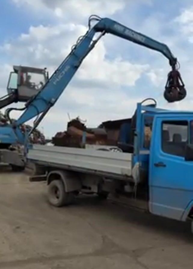 blue Fuchs excavator loading scrap metal into the bed of a light blue truck